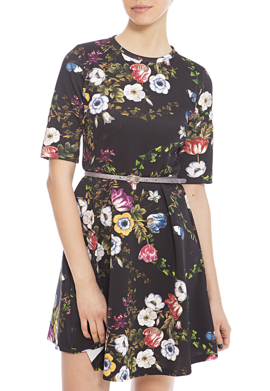 Детали: отрезная линия талии, облегающий крой лифа, круглый вырез горловины, втачной рукав длиной до локтя, юбка А-силуэта. Талия подчёркнута тонким серебристым пояском. Застёгивается потайной молнией на спинке.