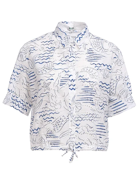 Детали: прямо свободный крой, отложной воротник, короткий втачной рукав, планка с рядом скрытых пуговиц, кулиска по нижнему краю, прошва, принт.