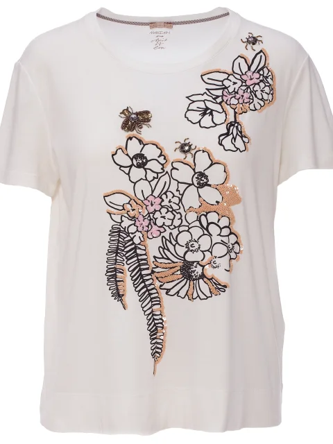 Детали: прямой крой, круглый вырез горловины, короткий рукав, на передней части цветочный принт, декорированный пайетками и бисером.