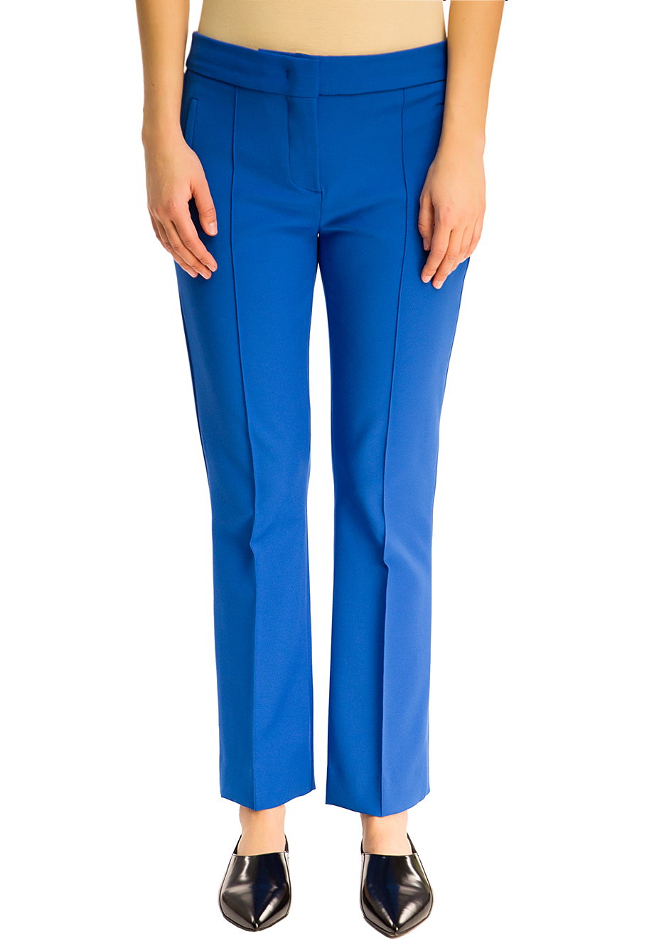 Детали: прямая форма, средняя посадка, прорезные карманы с рантом и молнией по бокам, сзади два прорезных с рантом, прошитые стрелки до колена.