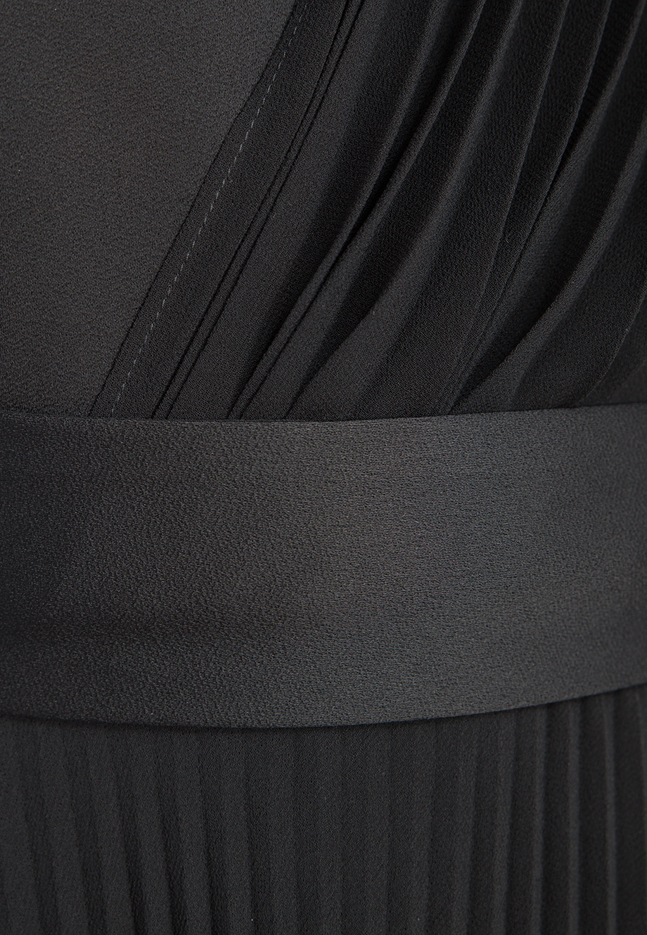 Детали: приталенный крой топа, V-образная форма декольте и вырез на спинке, отрезная линия талии, широкий вшитый пояс, двухслойные брюки клёш от бедра, плиссировка.