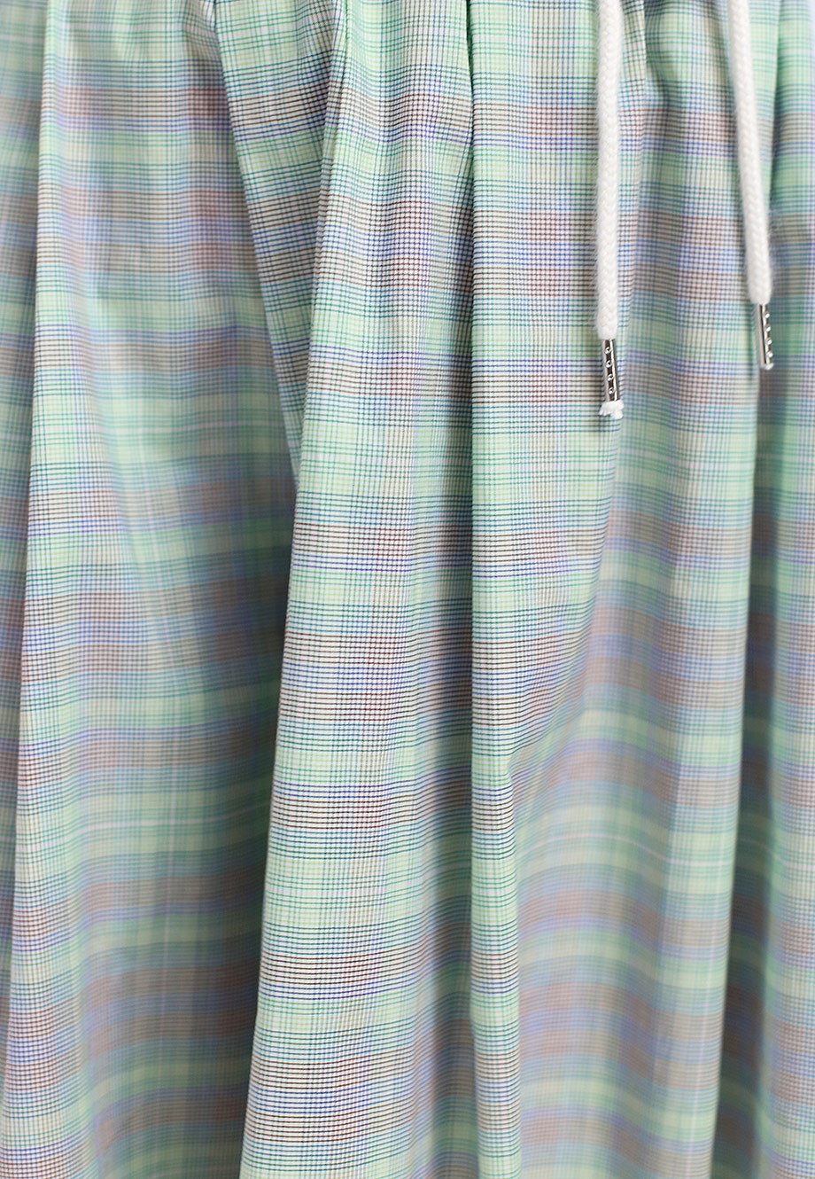 Детали: А-силуэт, высокая посадка, эластичный пояс с кулиской и резинкой, складки, прорезные карманы по боковым швам, длина миди, принт в клетку.