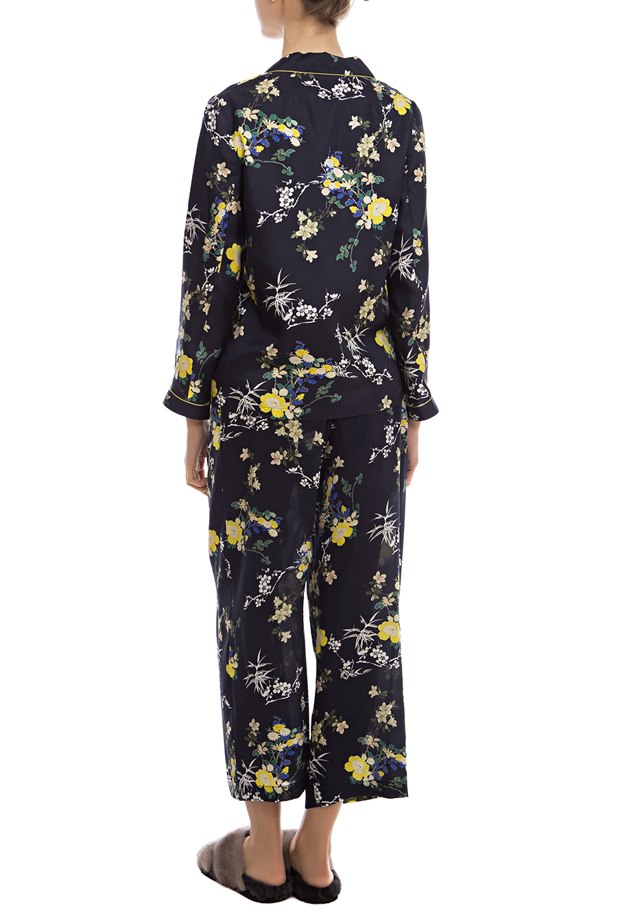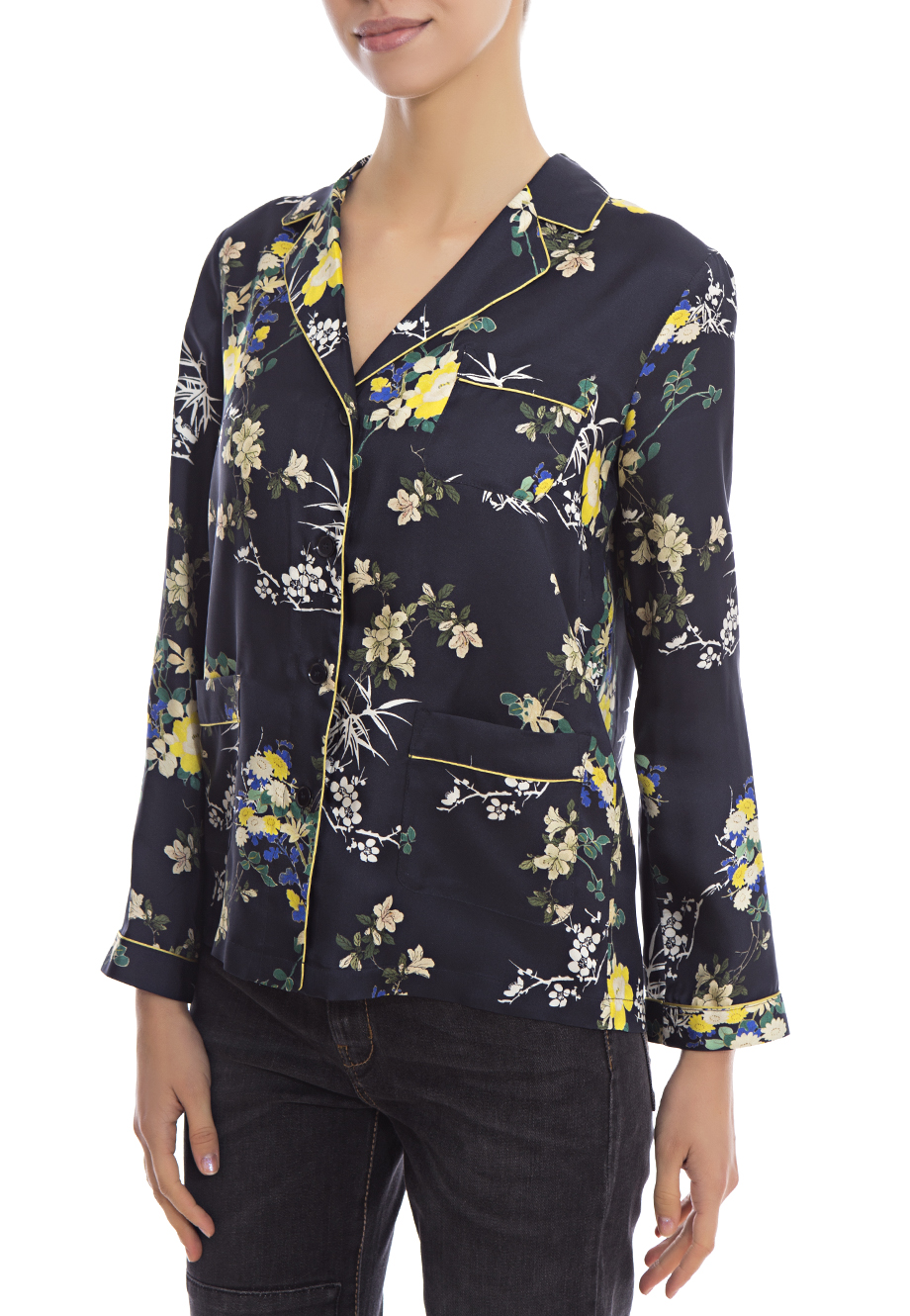 Детали: прямой крой, отложной воротник с небольшими лацканами, укороченный втачной рукав с кантом и подгибом, по бокам два накладных кармана, один на груди. Застегивается рядом пуговиц, цветочный паттерн.