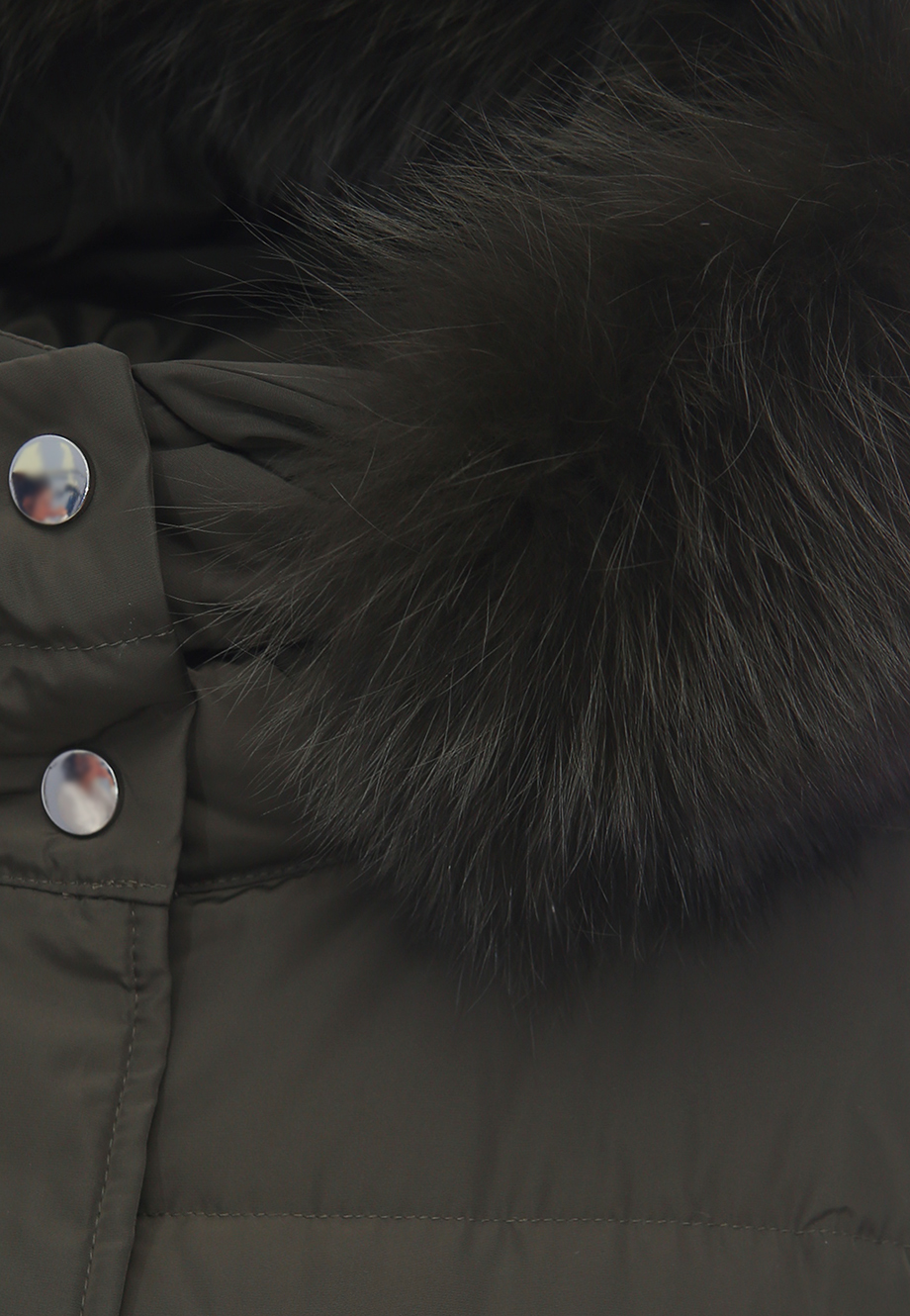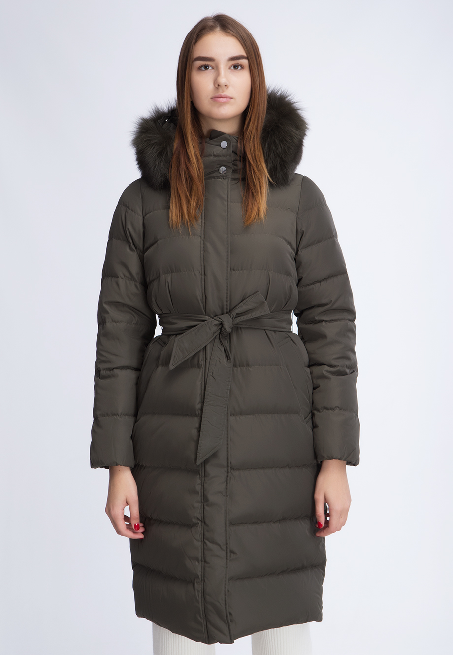 Детали: прямой крой, высокий ворот с капюшоном, длинный втачной рукав, прорезные карманы с рантом по бокам, пояс по линии талии, съёмный мех на капюшоне, застёгивается молнией и клапаном на кнопках. Утеплитель - пух/перо (90/10%)