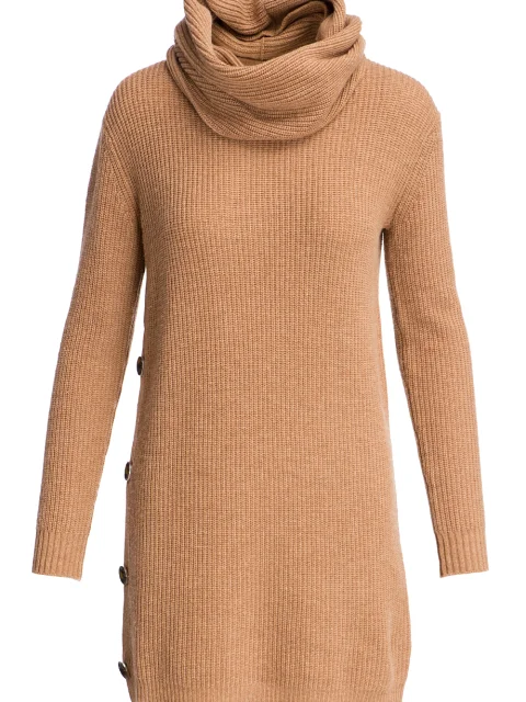 Детали: прямой крой, круглый вырез горловины, спущенный длинный рукав, декоративные пуговицы по боковому шву, фактурная вязка резинкой, дополнительный снуд.