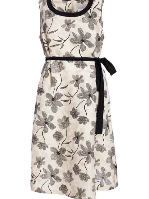 Детали: А-силуэт, круглая форма декольте с контрастным кантом, пояс по линии талии, цветочный принт, длина миди.