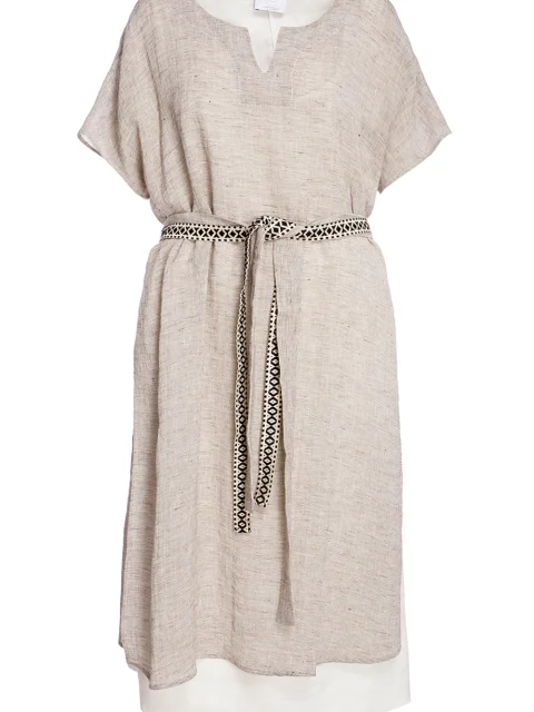 Детали: прямой крой под пояс, круглый вырез горловины с мысом, цельнокроеный короткий рукав, пояс с тесьмой, боковые разрезы, удлиненная подклада из хлопка.