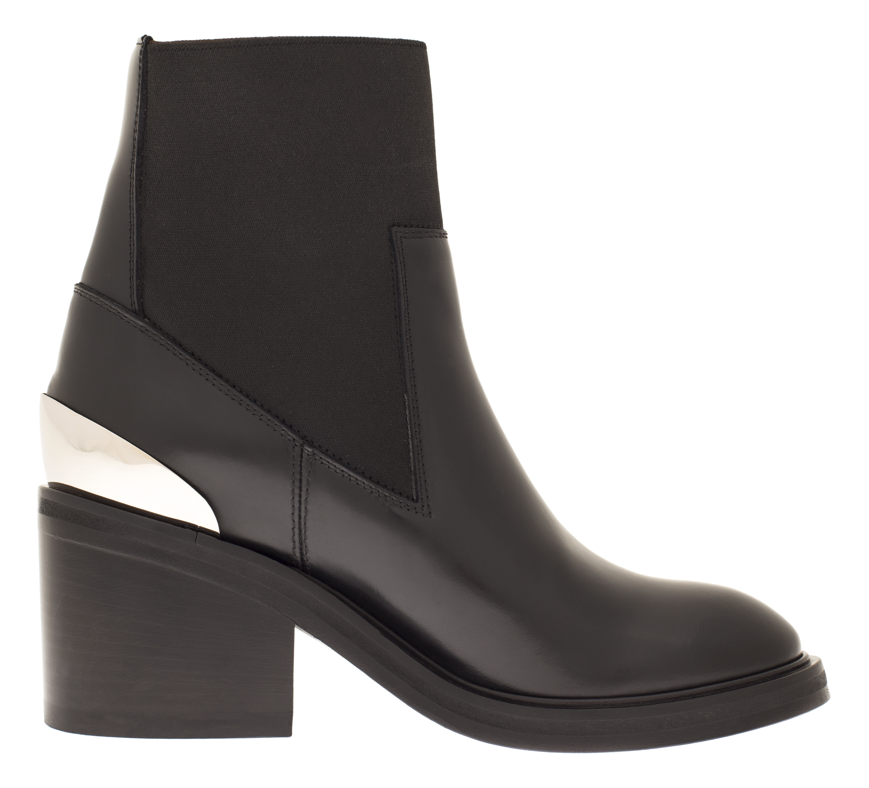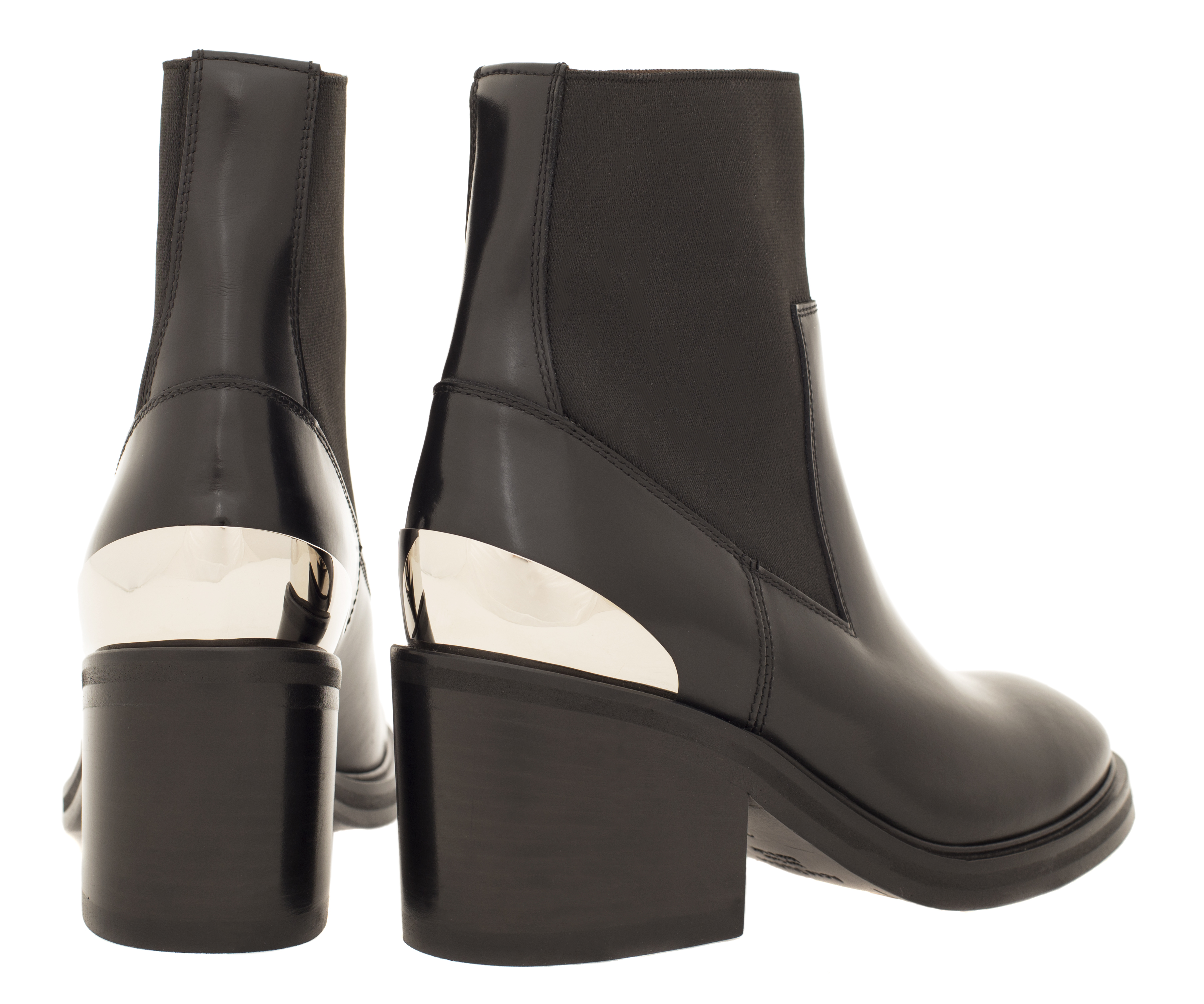 Детали: глянцевая гладкая кожа, толстая кожаная подошва, голенище из эластичной резинки с кожаной накладкой на заднике. На пятке металлическая пластина. Высота каблука 7,5 см.