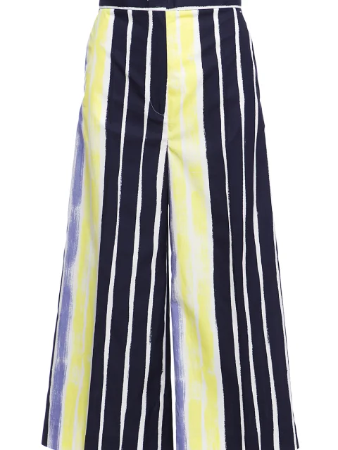 Детали: прямой свободный от бедра крой, высокая посадка, французские боковые карманы, сзади два прорезных с рантом, принт в акварельную полоску.