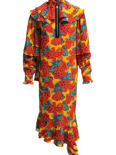 Детали: прямой крой, высокий ворот с оборкой, рюши на груди и на рукавах, длинный втачной рукав с манжетой на пуговице и оборкой по кромке, асимметричный подол с двойным воланом, молния на спинке.