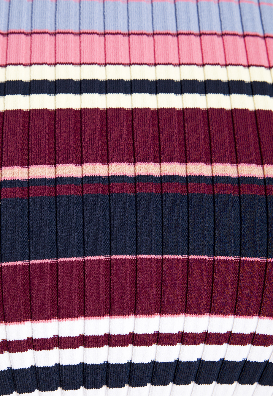 Детали: облегающий силуэт, круглый вырез горловины с высоким воротом, двойная прорезь по линии талии, фактура вязки в рубчик, цветная полоска, однотонная спинка.