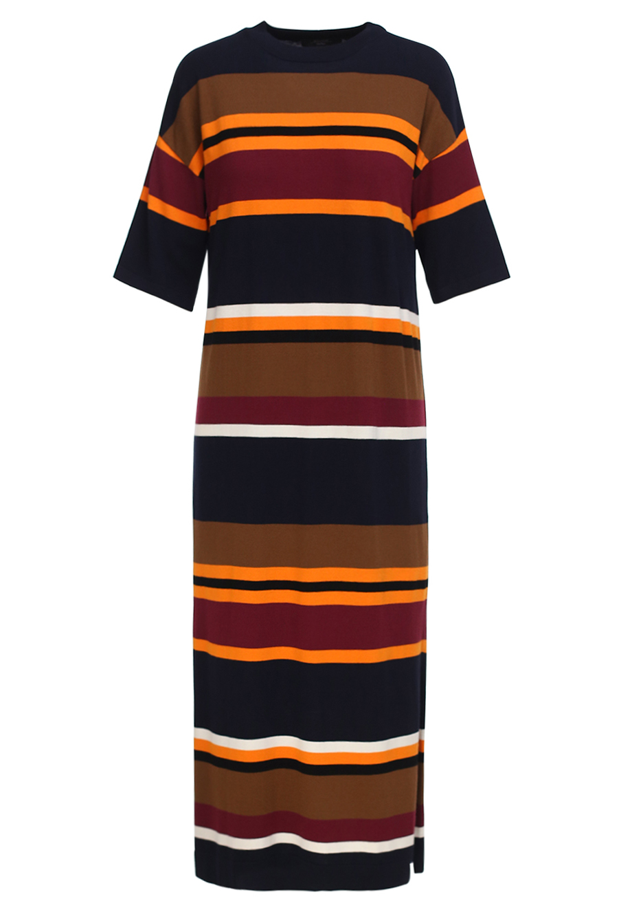 Прямой крой, круглый вырез горловины, спущенный короткий рукав, боковые разрезы, цветные полосы.