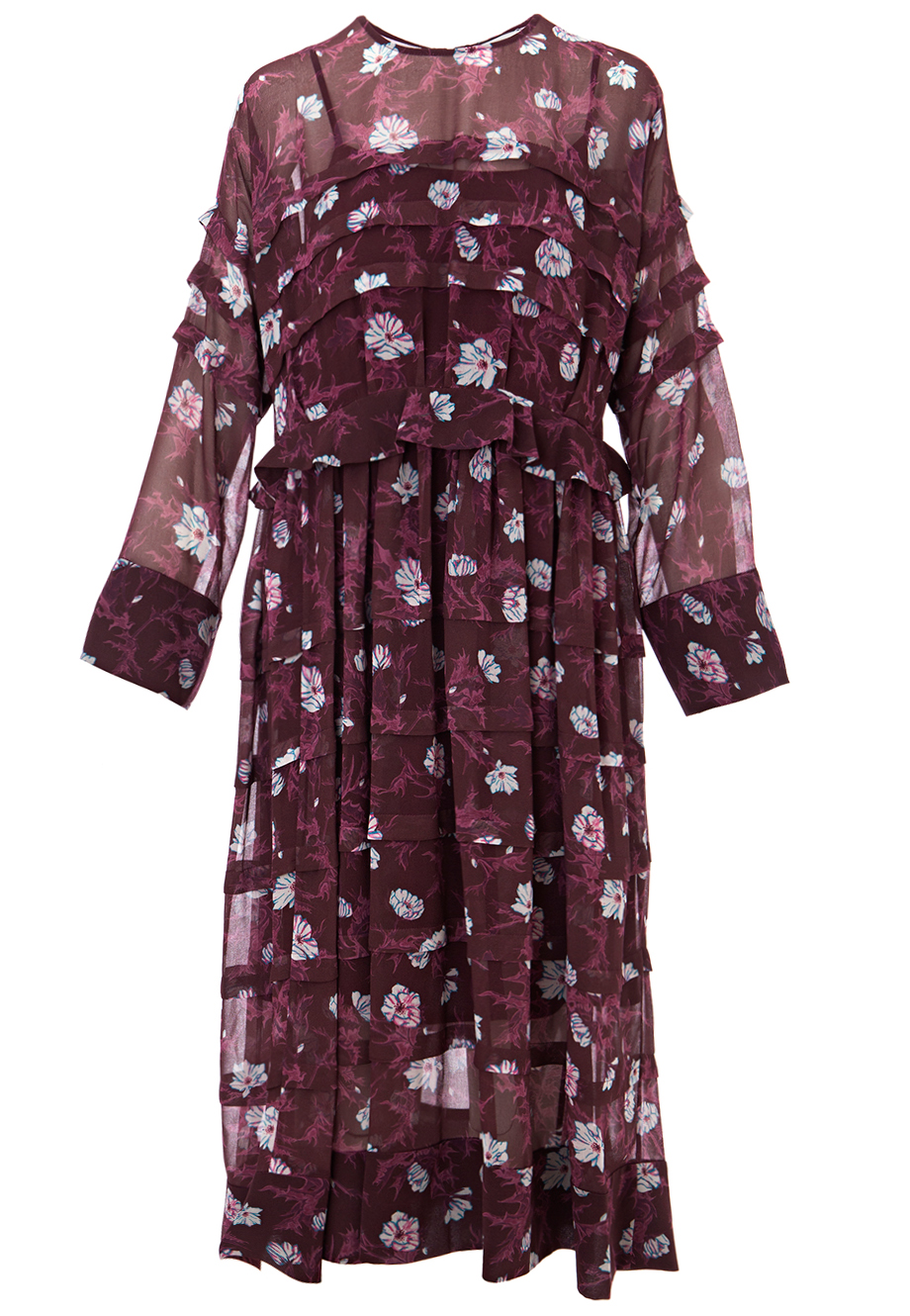 Детали: А-силуэт, круглый вырез горловины, перестроченные поперечные складки, укороченный втачной рукав с широкой манжетой, оборка по линии талии, широкий подгиб по подолу. Цветочный паттерн, подклада-комбинация, застегивается потайной молнией на спинке.