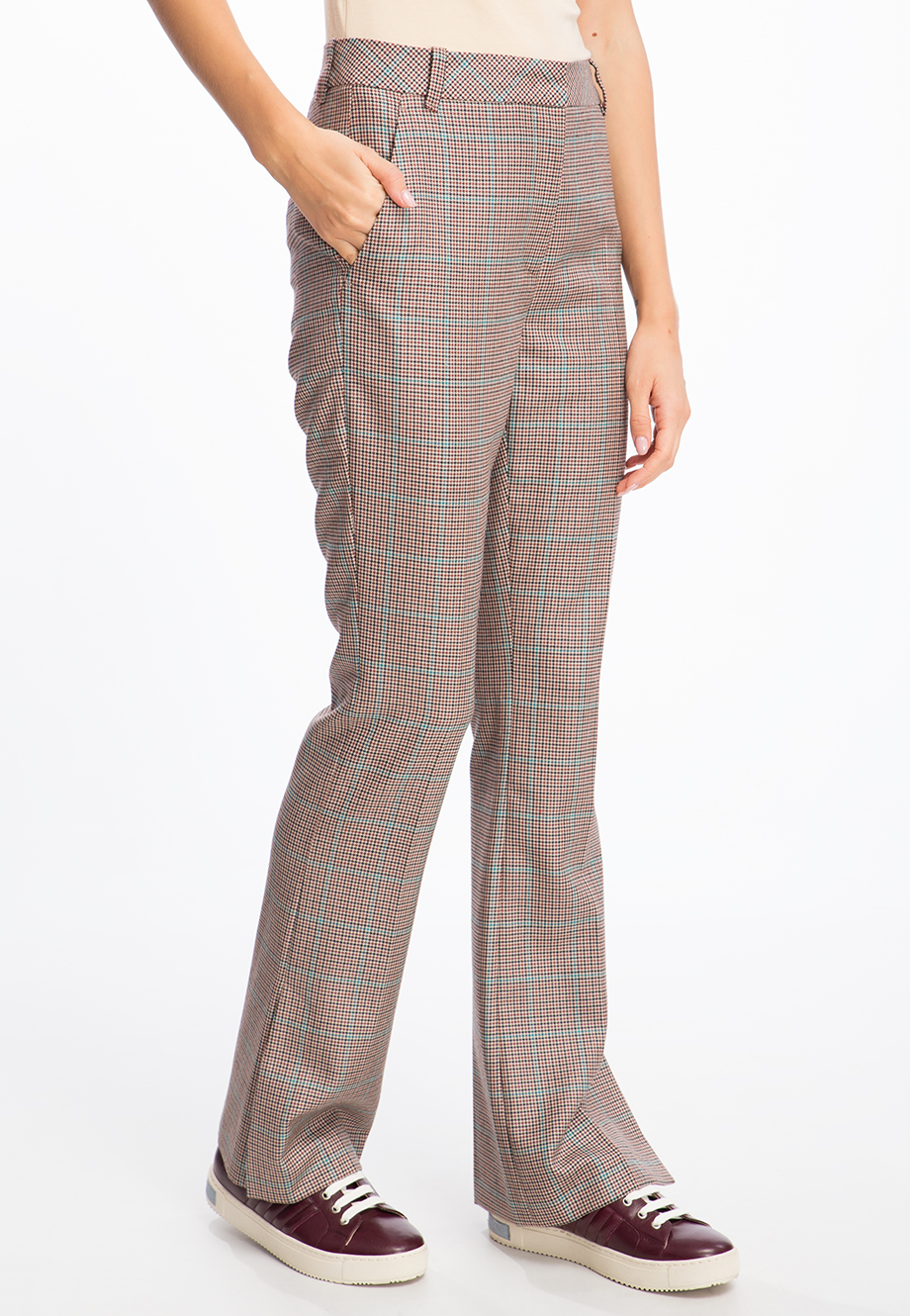Детали: прямой крой, высокая посадка, французские боковые карманы, сзади два прорезных с рантом, стрелки вдоль штанин, боковые разрезы к нижнему краю, принт в клетку.