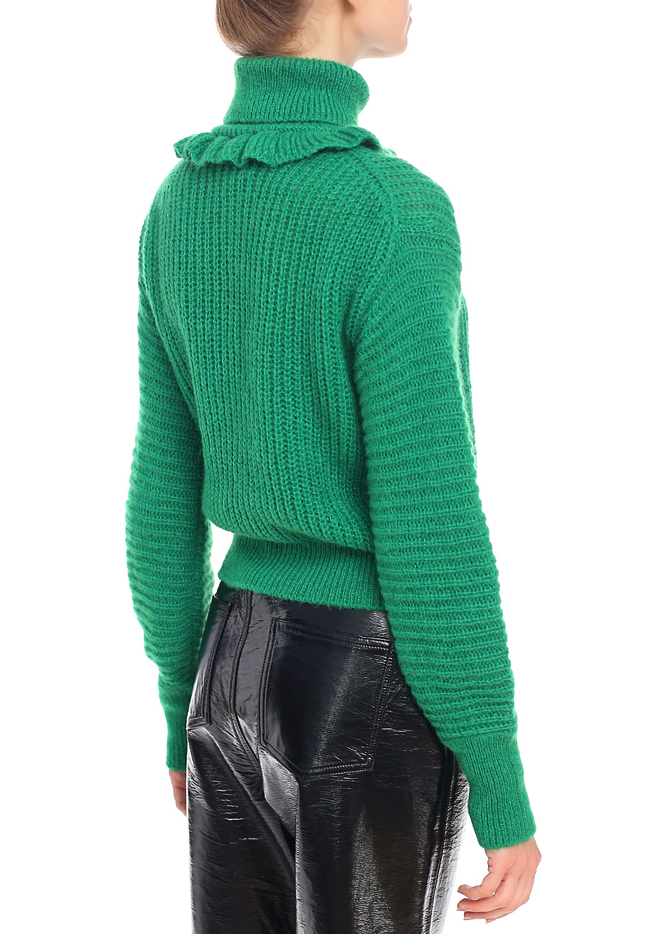 Детали: прямой крой, высокий ворот с отворотом, жабо, длинный втачной рукав, вязка резинкой, манжеты по нижнему краю и на рукавах.