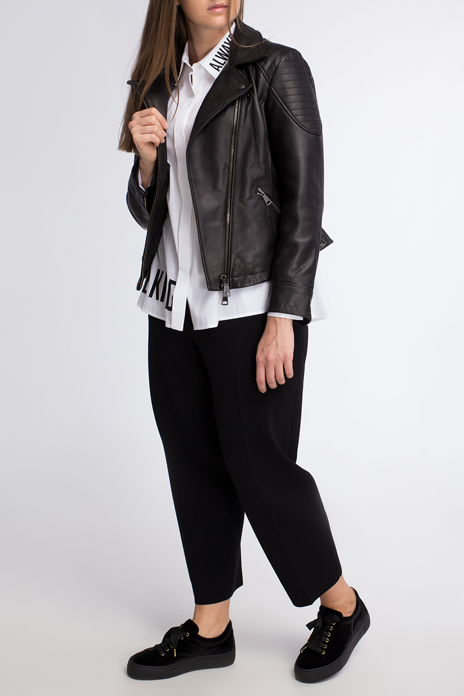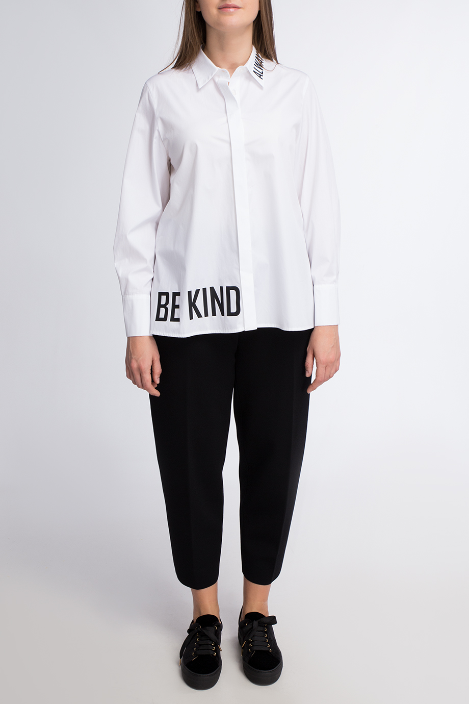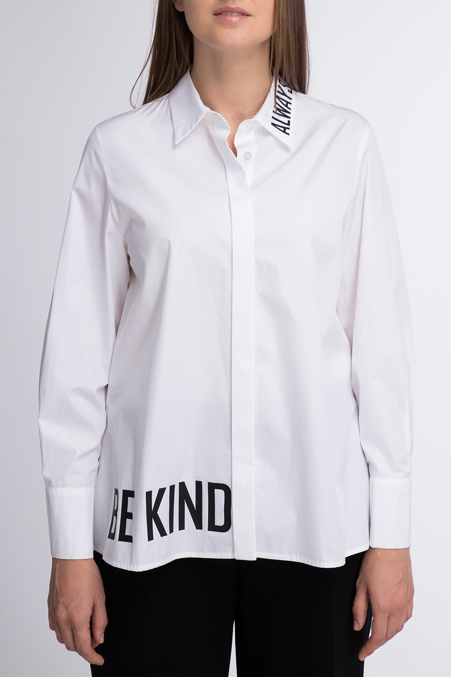 Детали: прямой крой, отложной воротник, длинный втачной рукав с манжетой на трёх пуговицах, принт на вороте и по нижнему краю, планка с рядом скрытых пуговиц.