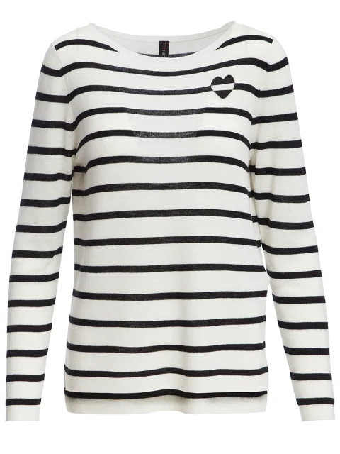 Детали: прямой крой, вырез горловины лодочкой, длинный втачной рукав, боковые разрезы, принт в полоску и сердечко на груди.