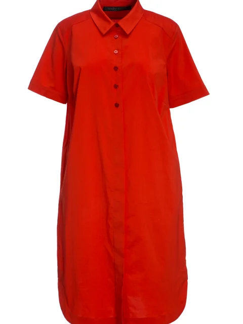 Детали: прямой крой, отложной воротник с планкой и пуговицами на груди, короткий втачной рукав, прорезные карманы по боковым швам, закругленный нижний край, длина ниже колена.