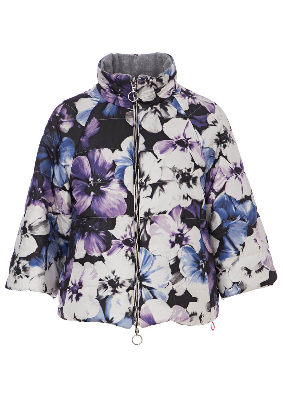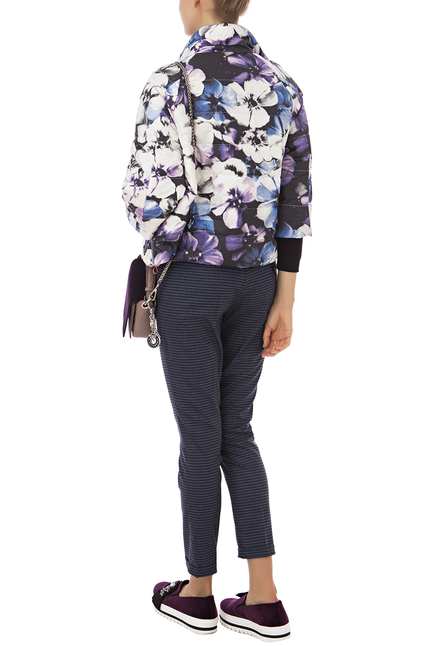 Детали: трапециевидный крой, ворот стойка, рукав реглан длиной ¾, одна сторона с цветочным паттерном, стёганная с прорезными карманами с рантом, вторая сторона из гладкого матового материала с меланжевым рисунком, с прорезными карманами с рантом. Застегивается молнией с двумя бегунками.