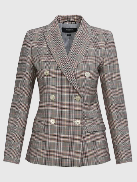 Приталений крій, відкладний комір з лацканами, довгий рукав, бокові кишені з клапанами, два рядки гудзиків, принт в клітинку «Принц Уельский».