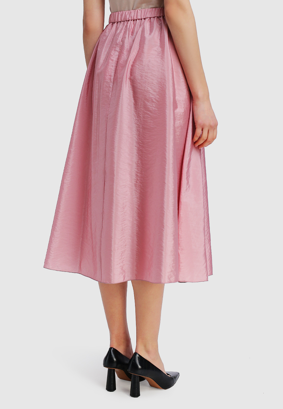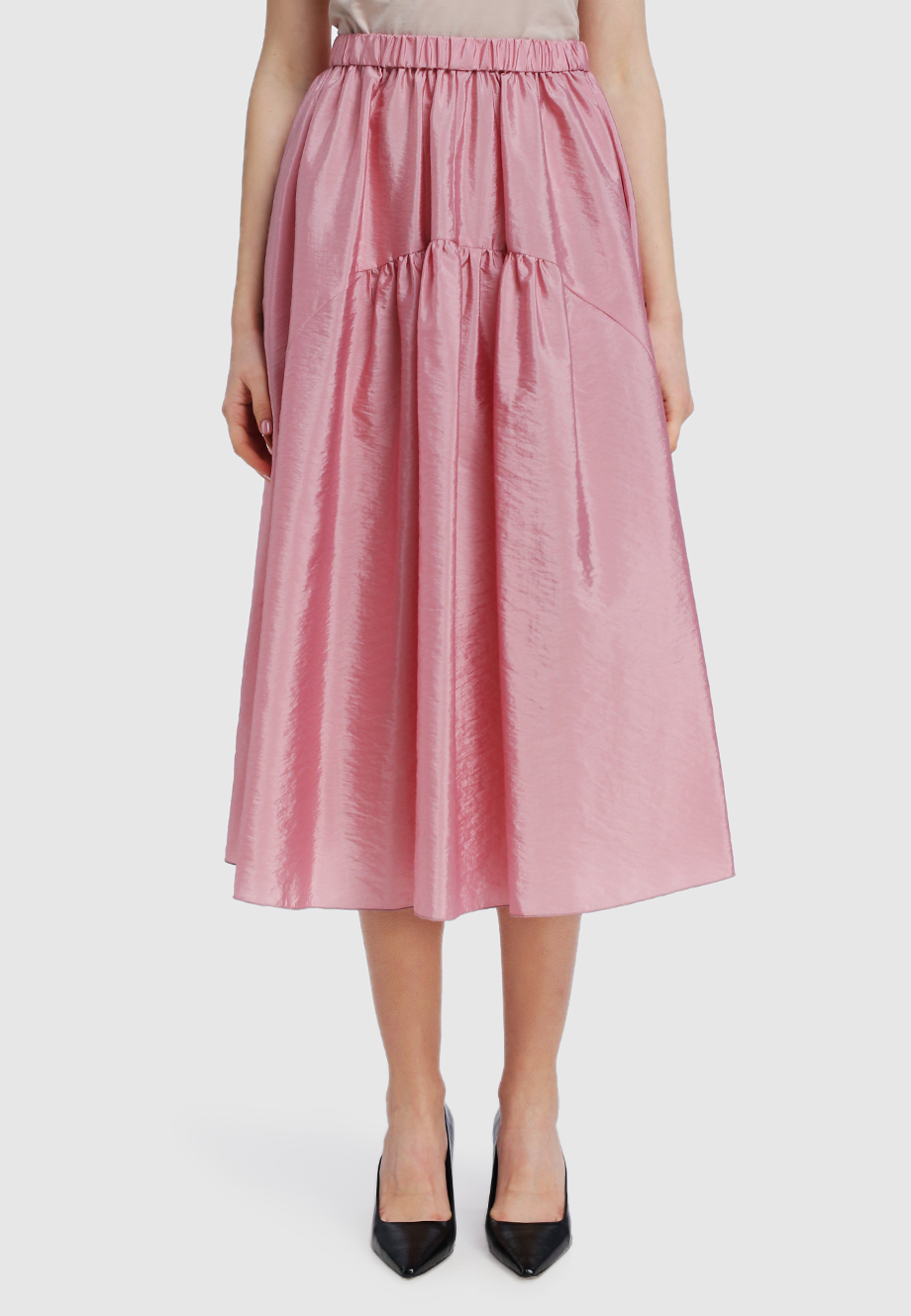 А-силует, висока лінія талії, еластичний пояс, подвійна збірка, довжина міді.