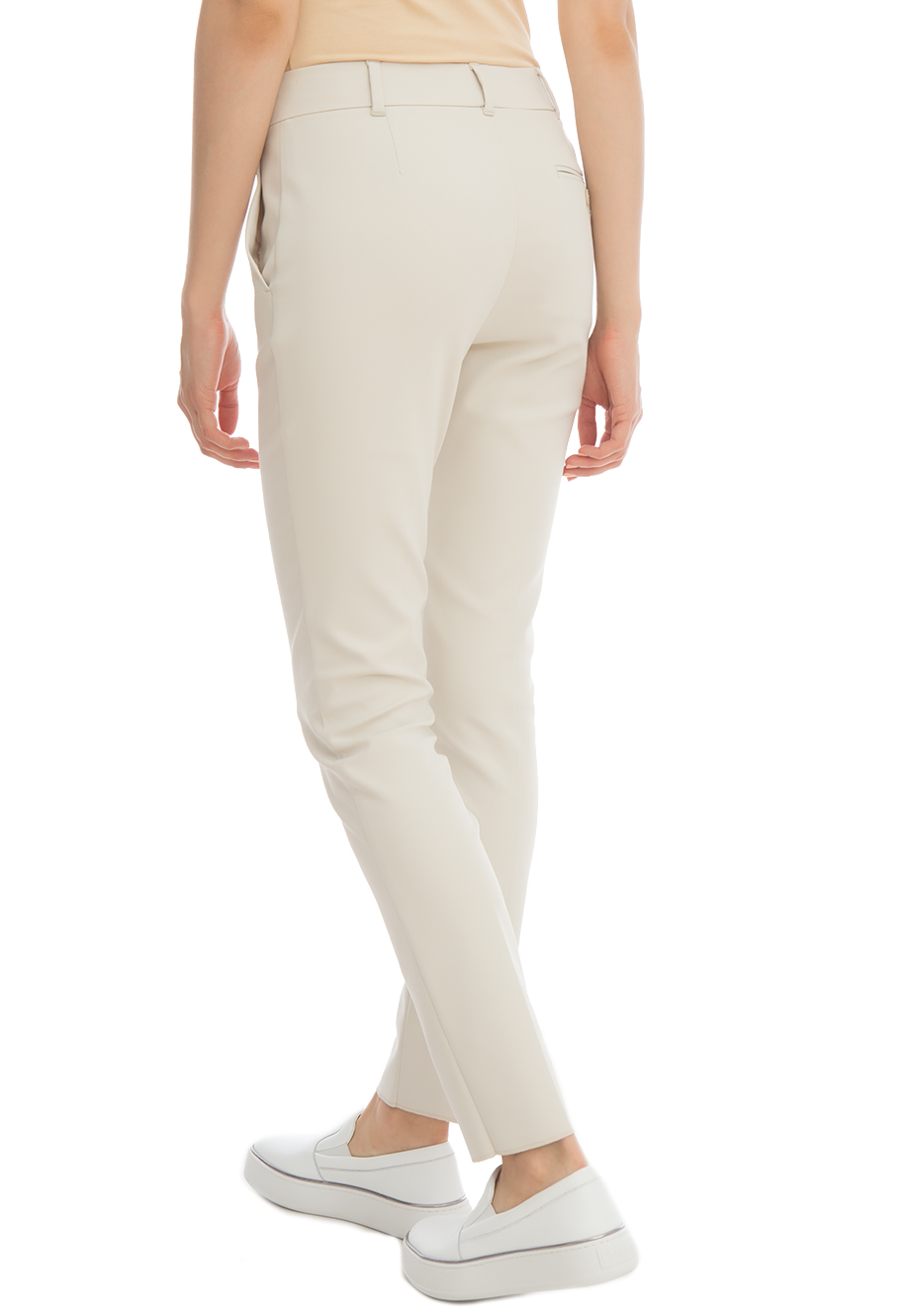 Детали: прямой крой, слегка зауженный книзу, высокая посадка, французские боковые карманы, сзади прорезные с рантом, боковые разрезы, длина до щиколоток. Пояс с потайным крючком, ширинка.