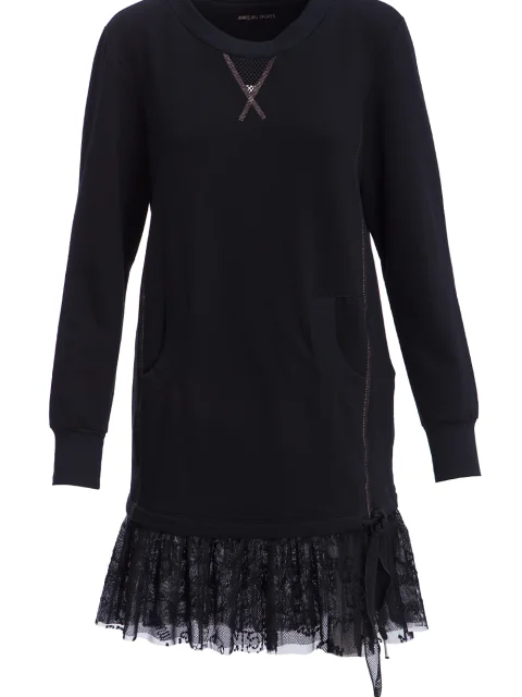 Детали: прямой крой, круглый вырез горловины, длинный втачной рукав с эластичной манжетой, большой карман-кенгуру, юбка из цветочного гипюра со сборкой.