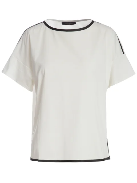 Детали: прямой свободный крой, круглый вырез горловины, короткий цельнокроеный рукав с подгибом, боковые разрезы, контрастный кант по шву.