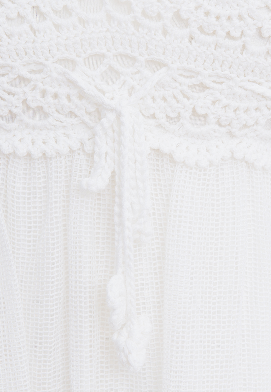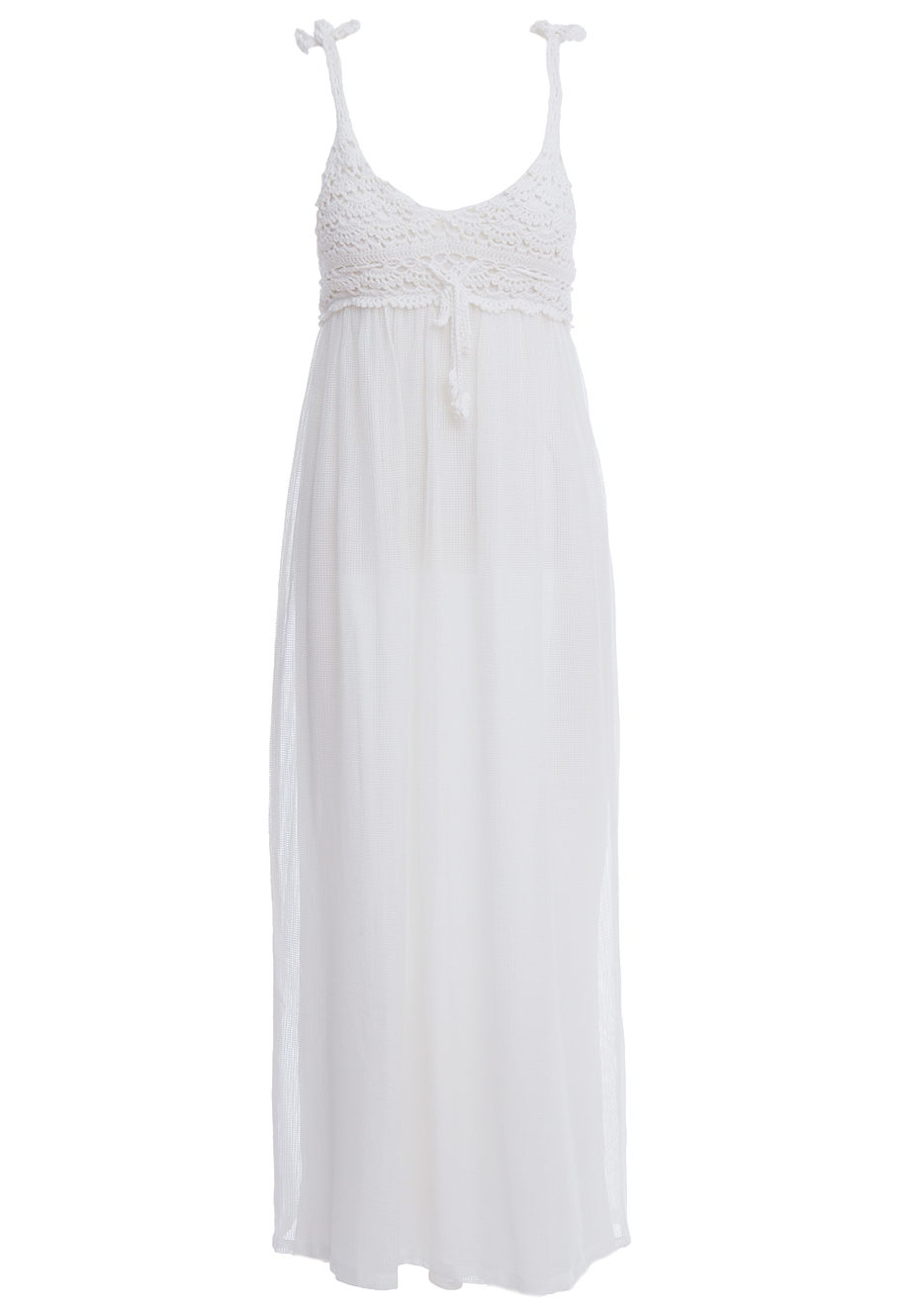 Детали: А-силуэт, кокетка из вязаного кружева макраме, тонкие бретели с завязками, от груди двуслойная юбка с мелкой сборкой. Верхний слой – сетка, нижний – хлопок. В комплекте с сарафаном – треугольная накидка-платок из сетки с кружевом.