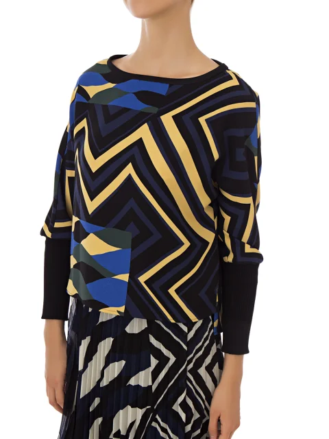 Детали: прямой крой, вырез горловины лодочкой, длинный рукав с высокой манжетой. Комбинация геометрических принтов блоками.