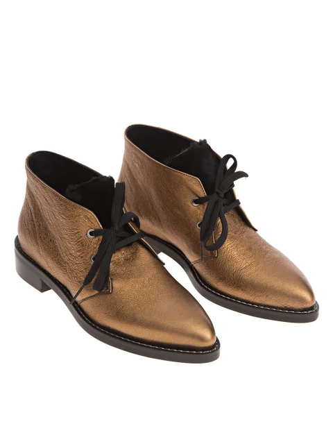 Детали: заострённый носок, подошва с рантом и строчкой, каблук высотой 2 см, язычок с меховой отделкой, шнуровка. Высота голенища до щиколотки.