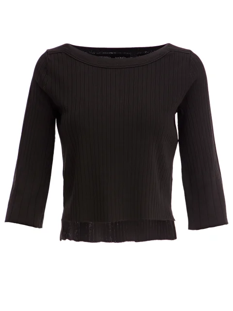 Детали: прямой крой, вырез горловины лодочкой, втачной рукав длиной ¾, боковые разрезы, удлинённая спинка.
