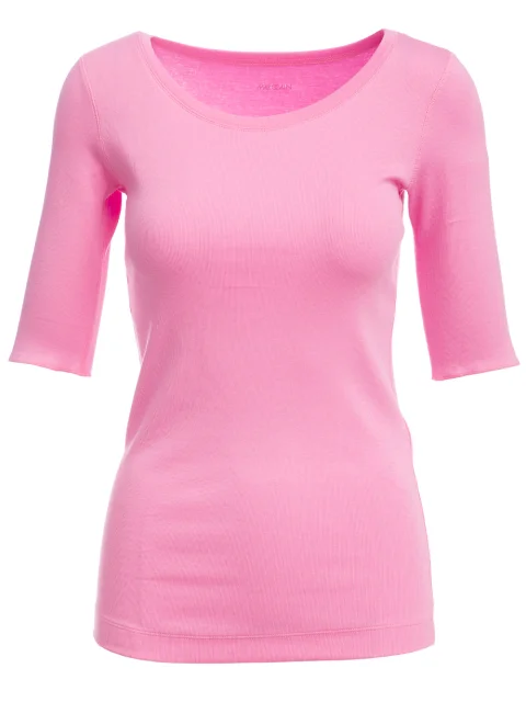 Детали: облегающий крой, круглый вырез горловины, втачной рукав длиной до локтя, фактура джерси в рубчик.