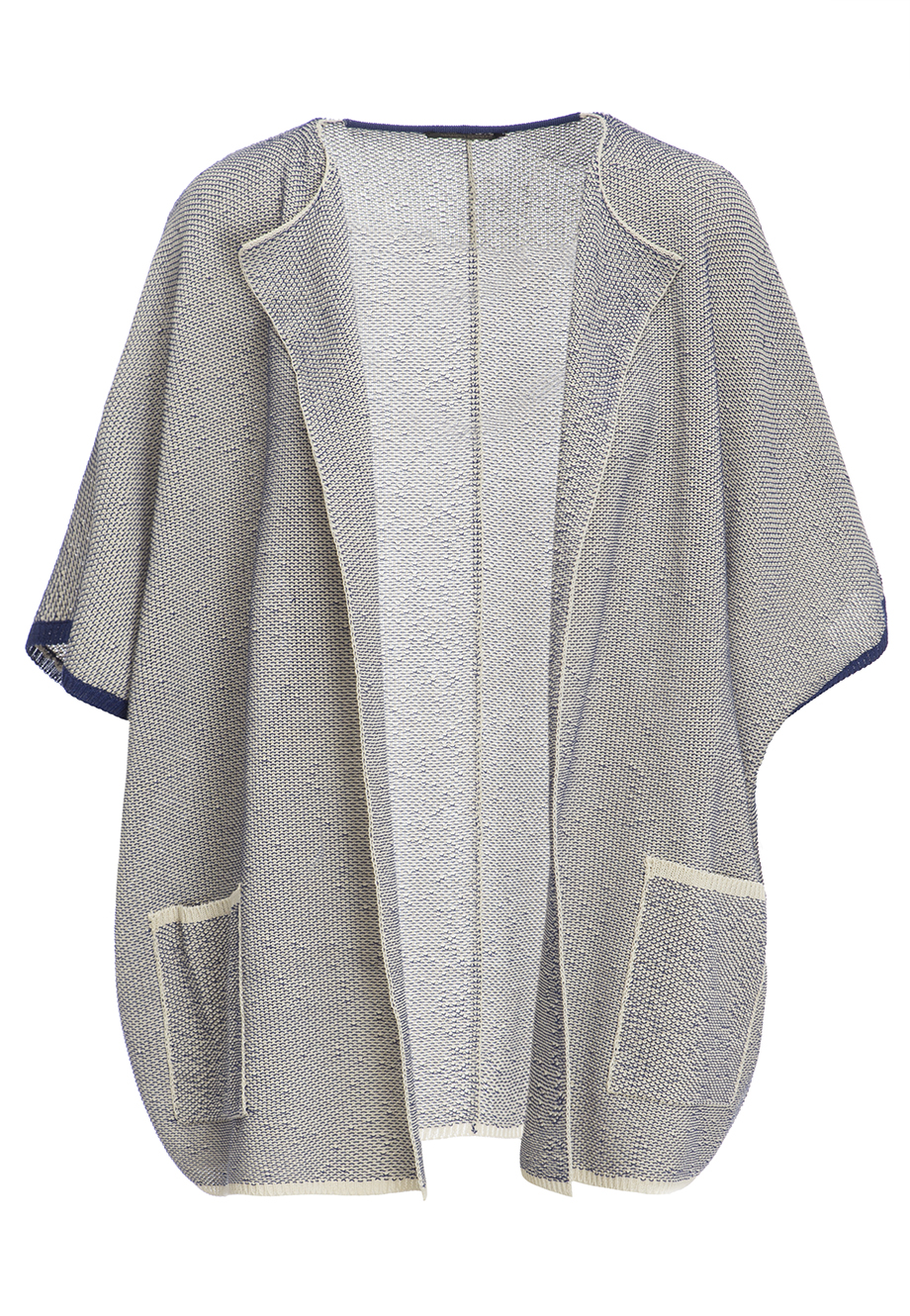 Детали: прямой крой, цельнокроеный короткий рукав, накладные карманы по бокам, жаккардовая двуцветная вязка.