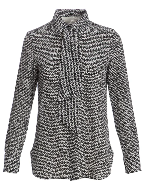 Детали: прямой крой, отложной воротник, длинный втачной рукав с манжетой на пуговице, монохромный микро-принт.