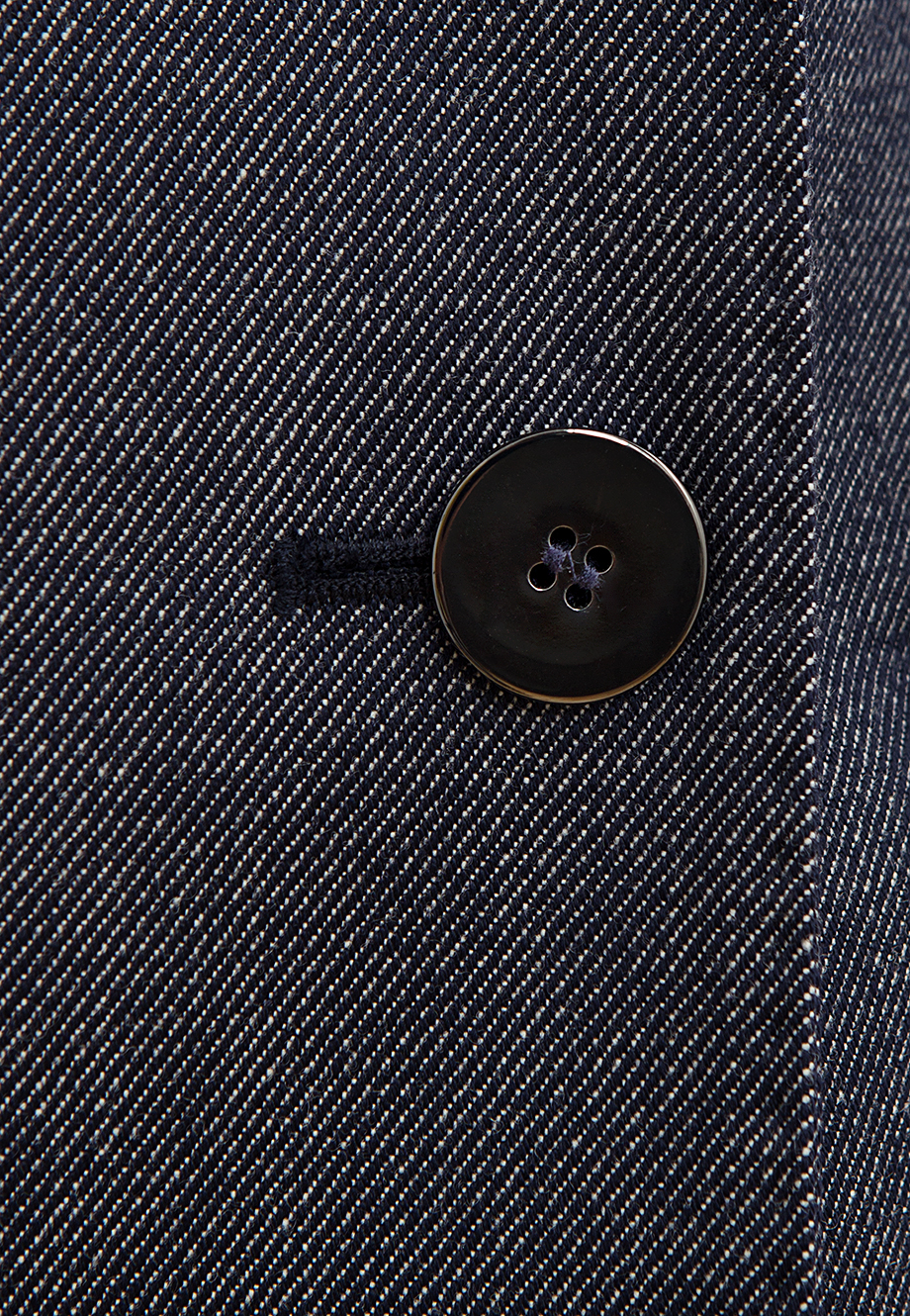 Детали: традиционный крой, отложной воротник с лацканами, длинный втачной рукав с рядом пуговиц, по бокам карманы с клапаном, застегивается двумя рядами пуговиц. Фактура ткани с эффектом денима.