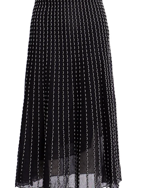 Детали: А-силуэт, высокая посадка, плиссировка с перестрочками и контрастной кромкой.