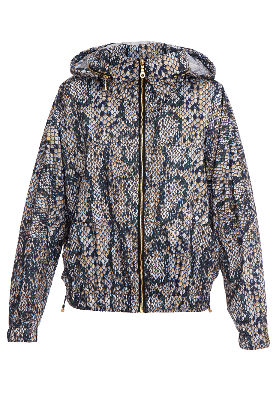 Детали: овальный крой, отложной воротник, спущенный объемный рукав с эластичной манжетой, эластичная манжета по нижнему краю, прорезные карманы по бокам. На спине большой логотип. Застегивается золотистой металлической молнией. Принт имитирующий рептилию.