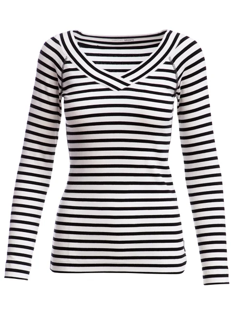 Детали: облегающий крой, V-образный мыс с широким кантом, длинный рукав реглан, наружная отделка швов, принт в полоску.
