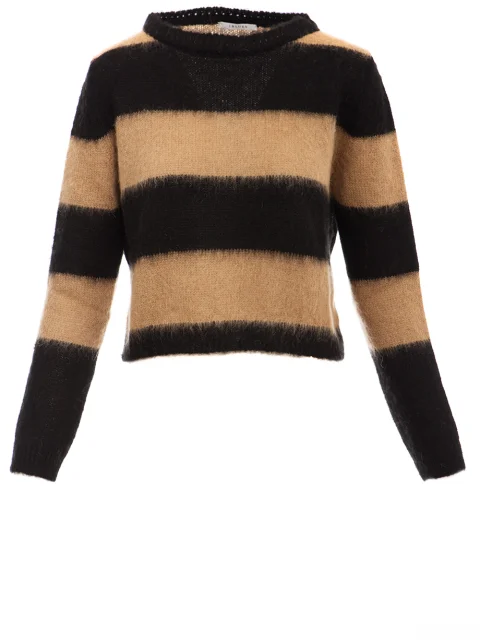 Детали: прямой свободный крой, круглый вырез горловины, длинный втачной рукав, пушистая фактура пряжи. Поперечные полосы.