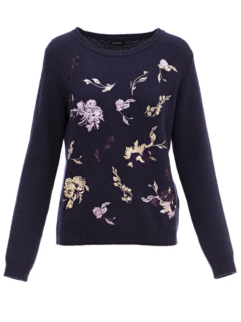 Детали: прямой крой, круглый вырез горловины, длинный втачной рукав, фактурная вязка, цветочные нашивки.