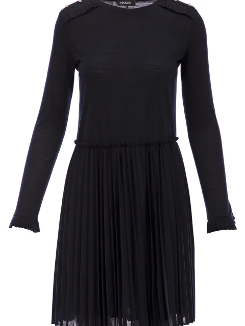 Детали: А-силуэт, заниженная отрезная линия талии, неравномерная фактура джерси, круглый вырез горловины, длинный втачной рукав, декоративные погоны с плиссе. Юбка из плиссированного джерси, на рукавах декоративные плиссированные воланы.