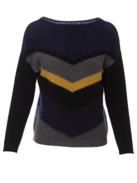 Детали: прямой крой, вырез горловины лодочкой, спущенный длинный рукав, на груди геометрический зигзагообразный узор, фактурная вязка.