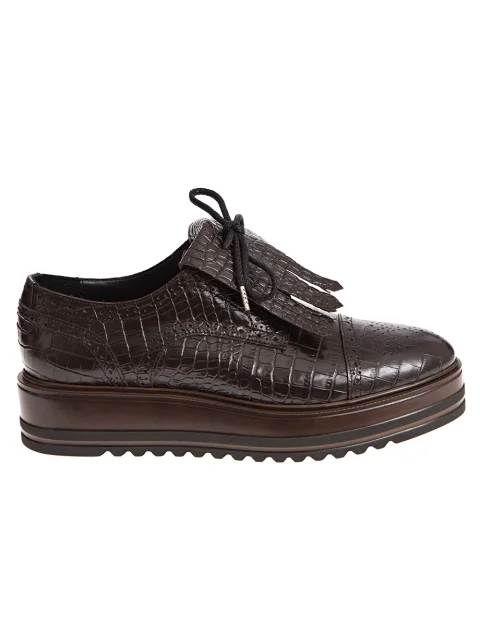 Детали: закруглённый носок, традиционная перфорация, высокая двойная подошва, тиснение, имитирующее кожу рептилии, шнуровка, декоративная бахрома на шнуровке.