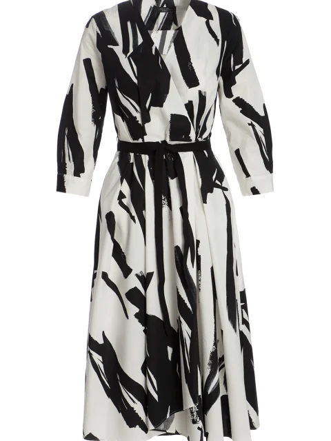 Детали: А-силуэт, вырез декольте, втачной рукав длиной ¾, собранный широкой манжетой, юбка в глубокие складки, пояс по линии талии, абстрактный монохромный принт.