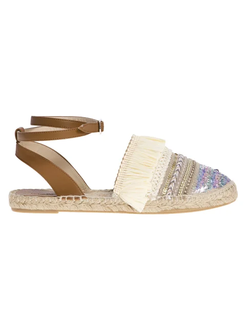 Детали: закрытый мыс, декор пайетками, бисером и бахромой, кожаные ремешки вокруг щиколотки и пятки, традиционная плетёная подошва.