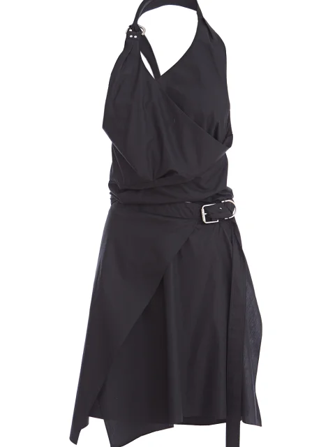 Детали: А-силуэт, лиф на запах с затяжкой вокруг шеи, отрезная линия талии с вырезом, юбка длиной до колена на запах, пояс с золотистой пряжкой и люверсами. Застегивается потайной молнией на спинке.
