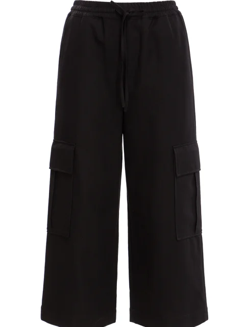 Детали: прямой свободный от бедра крой, высокая посадка, пояс на кулиске с резинкой, французские боковые карманы, один накладной сзади и два с клапаном на штанинах.