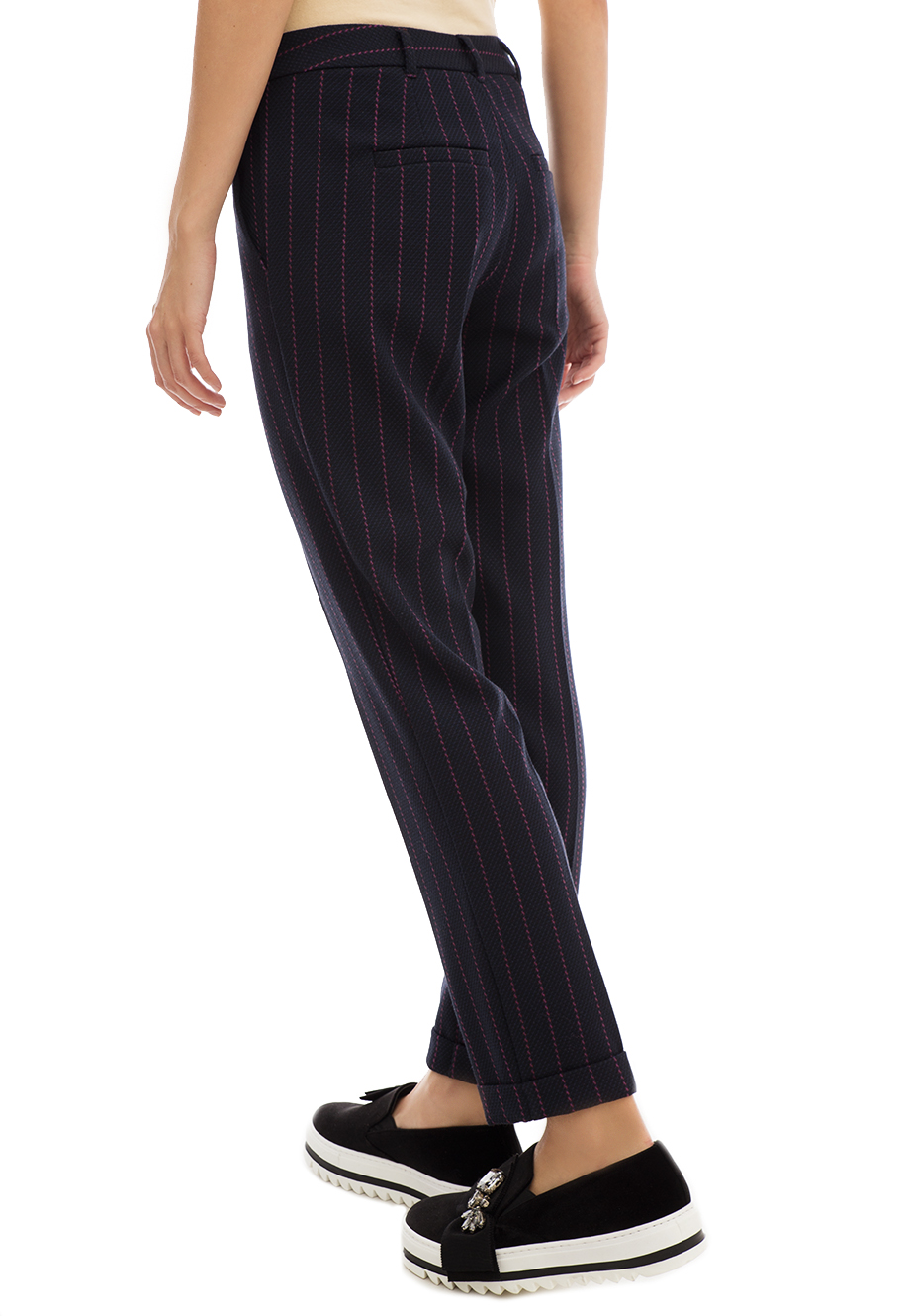 Детали: прямой крой, зауженный книзу, высокая посадка, французские боковые карманы, сзади два прорезных с рантом, пояс со шлёвками для ремня, крючок, ширинка, отвороты по нижнему краю.