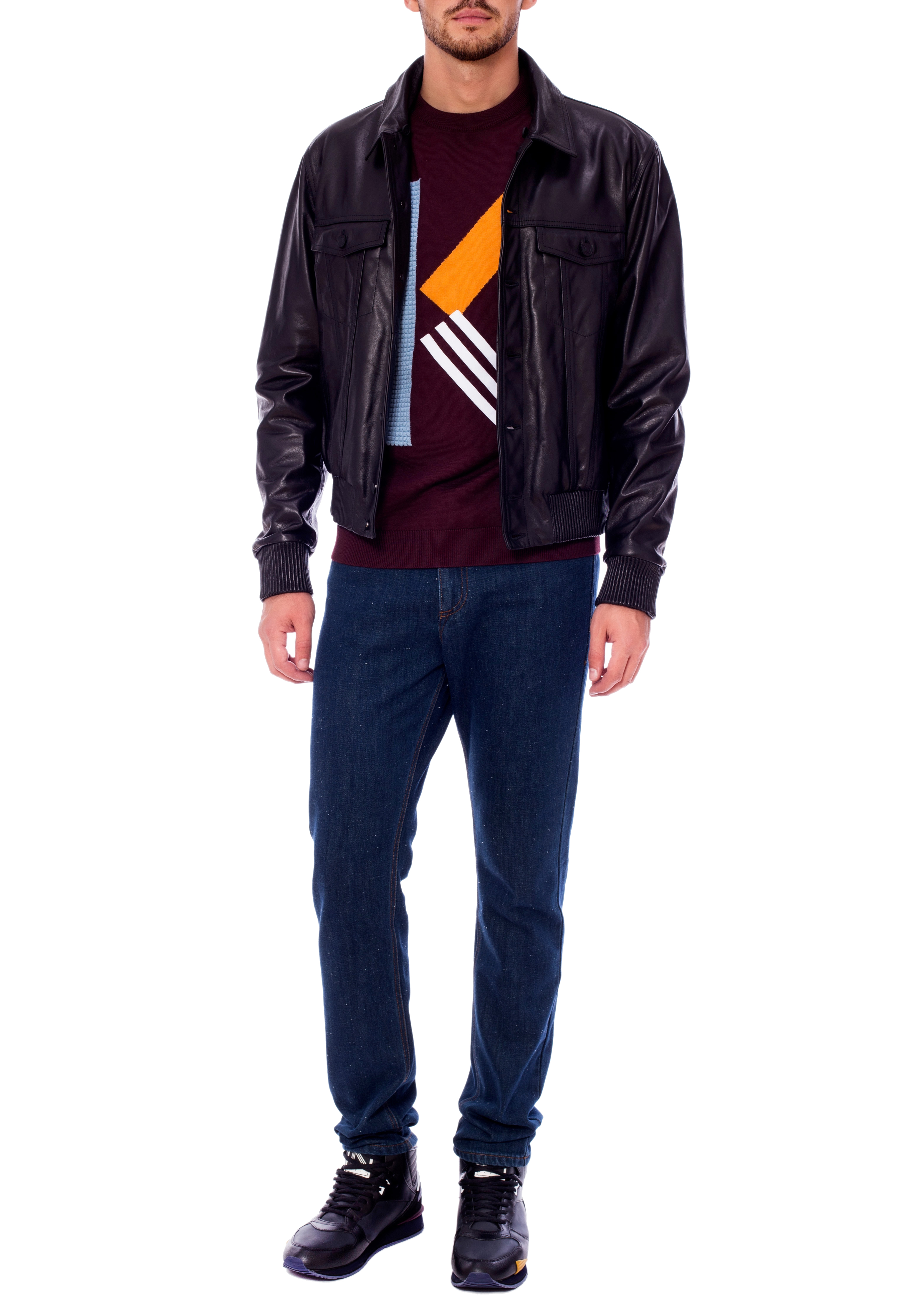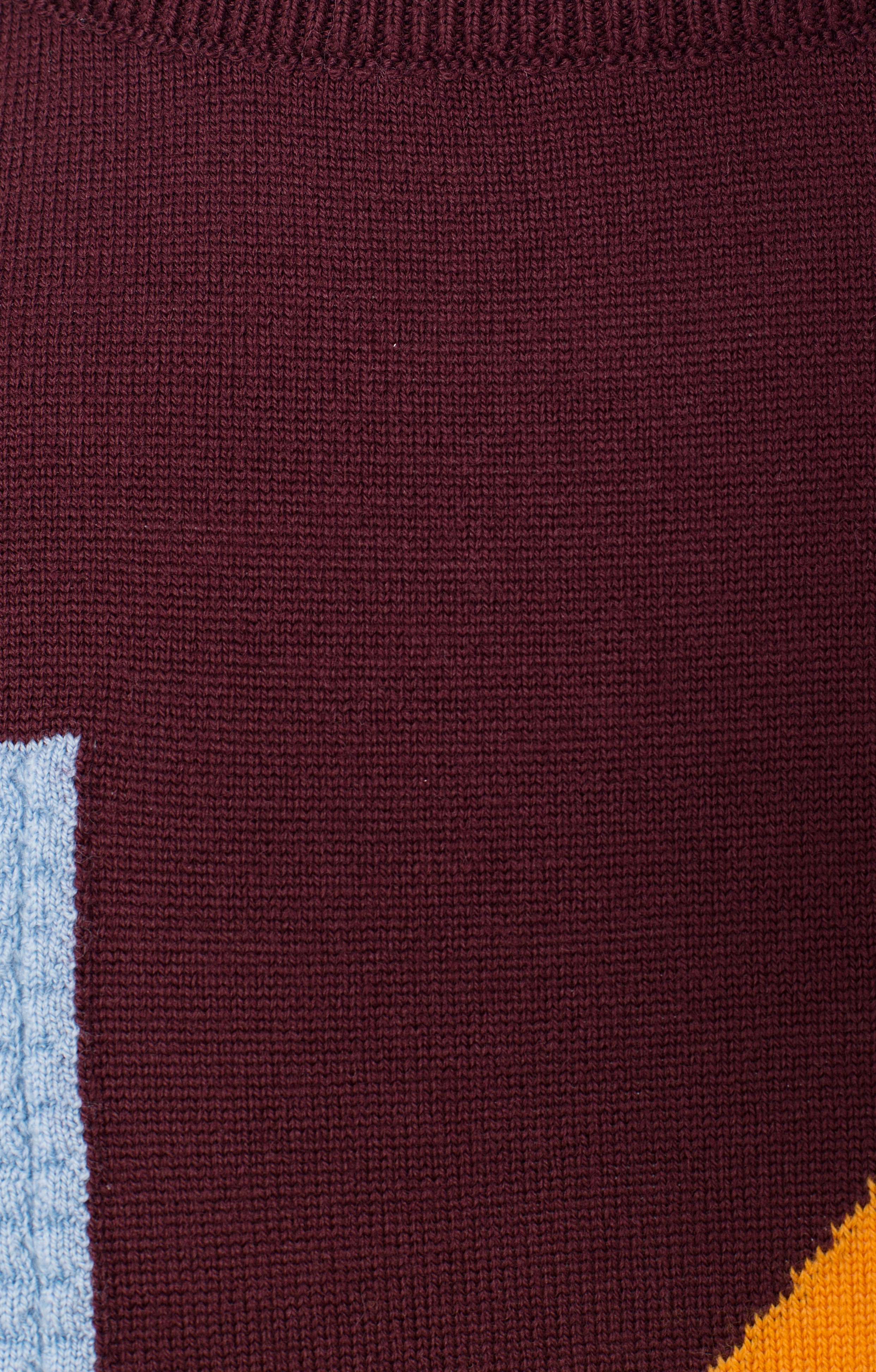 Детали: прямой крой, круглый вырез горловины, втачной рукав, манжеты по нижнему краю и рукавам, рукава контрастного цвета и фактурной вязки, цветная текстурная аппликация.